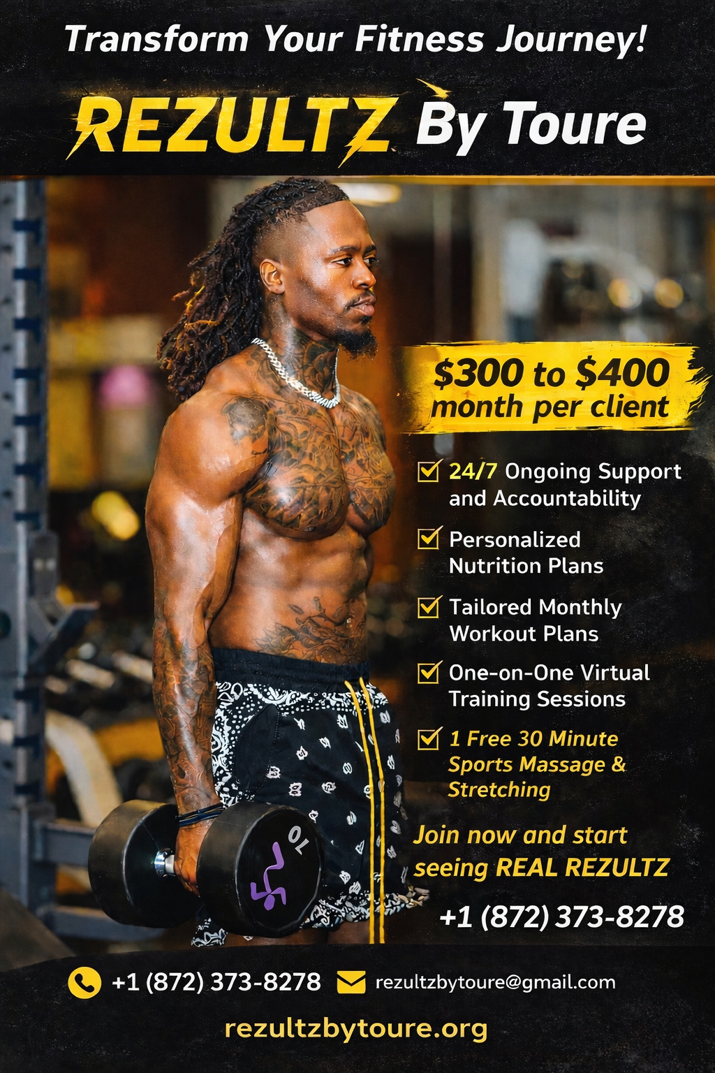 Welcome to Rezultz by Toure! I provide a comprehensive personal training experience designed for everyone no matter your fitness level or background. Whether you’re aiming to build muscle, recover from injuries, enhance athletic performance, or simply achieve a healthier, more functional body, I’ve got you covered. My services include 24/7 support and accountability, personalized nutrition plans, custom tailored workouts, and one on one virtual training sessions. At Rezultz by Toure, I’m dedicated to helping everyone, men and women, achieve their fitness goals and that phenomenal physique you’ve always wanted. Let’s get stronger, healthier, and REZULTZ together!
